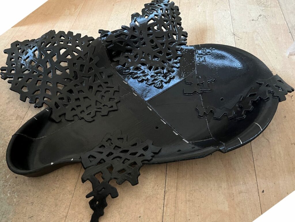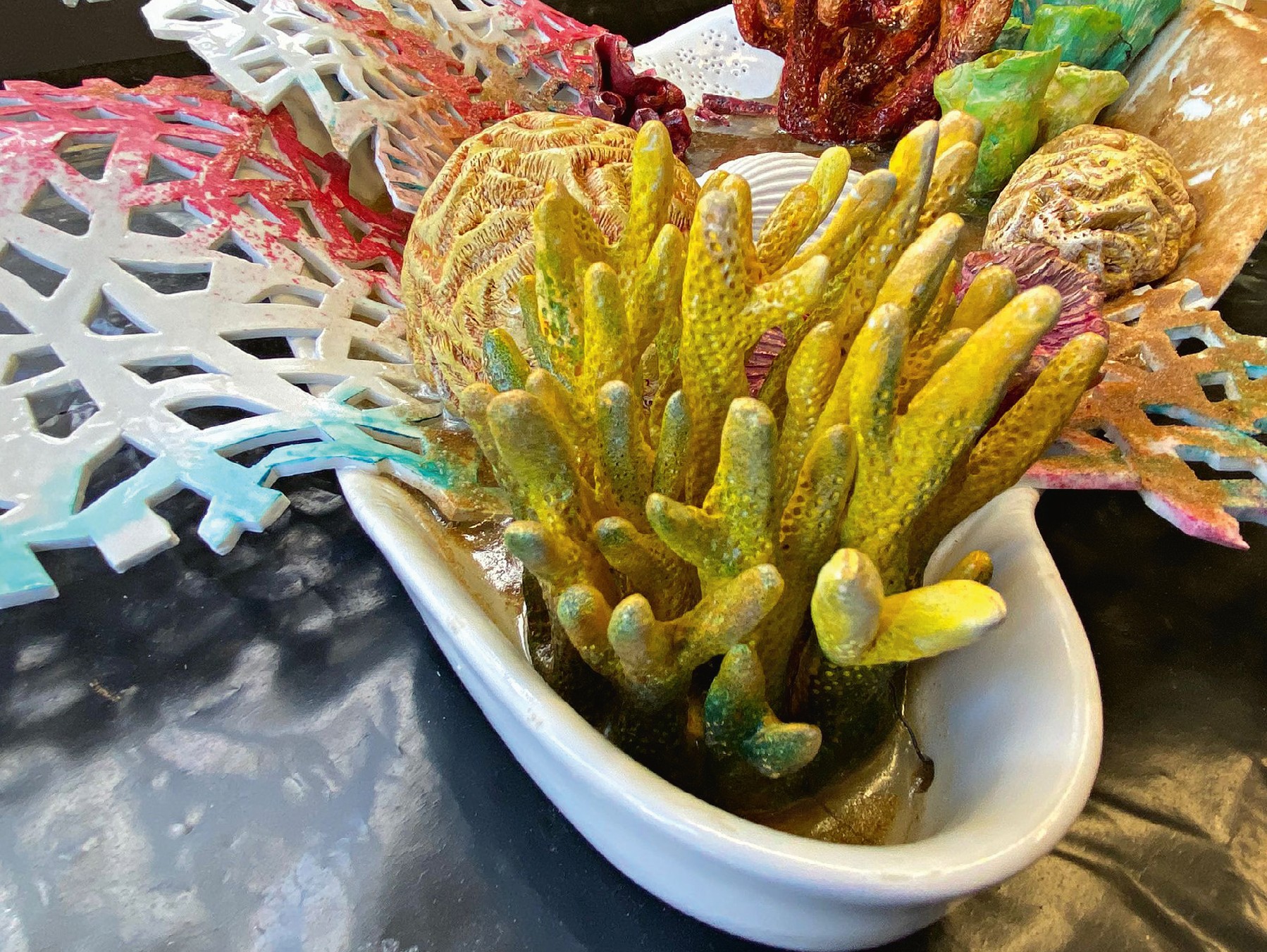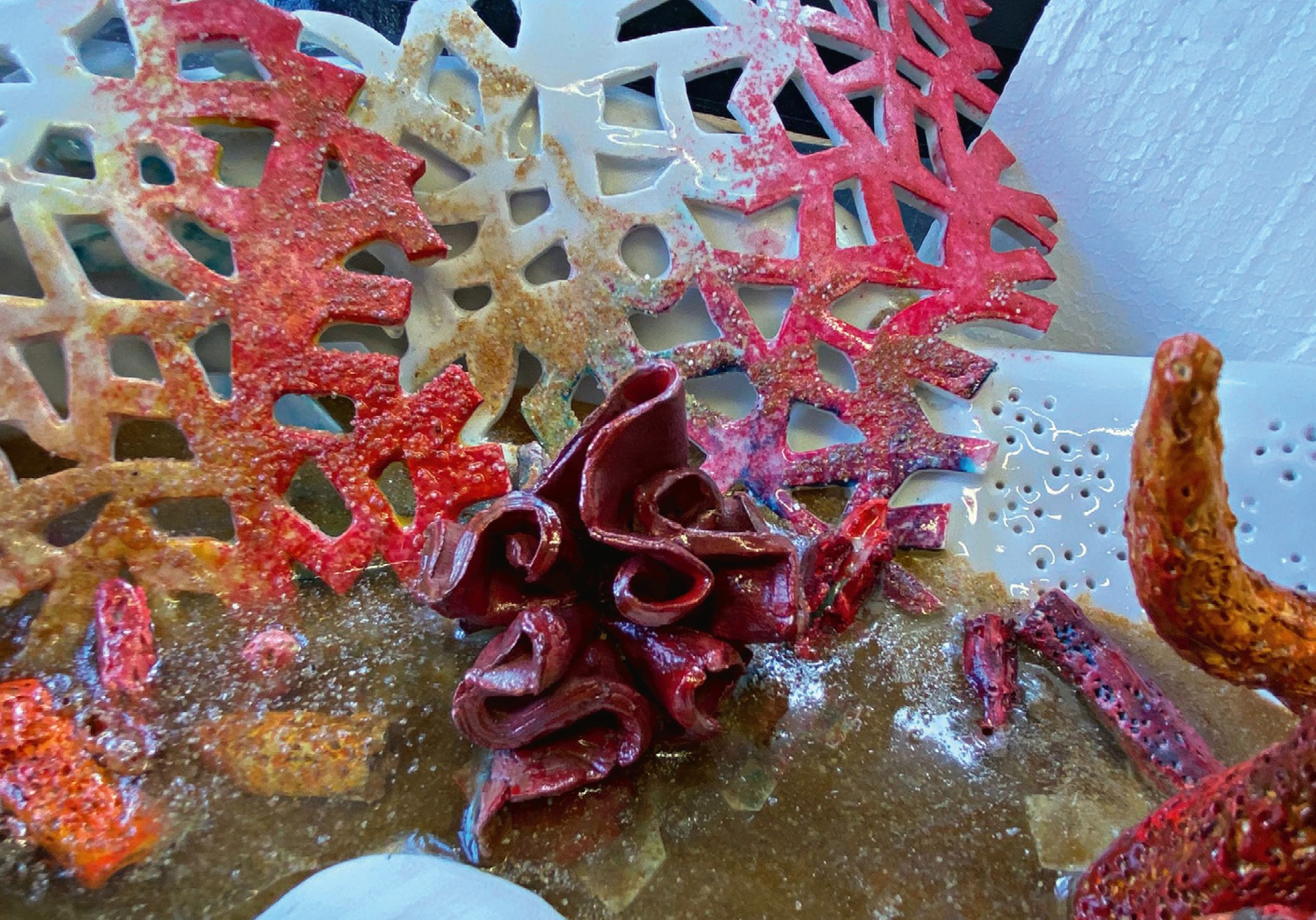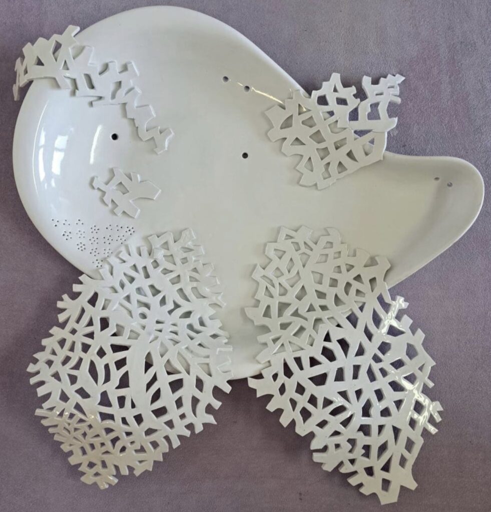 Technologie: materiály – porcelán, keramika (terakota, hrnčířská hlína, šamot), epoxid, kov a univerzální modelářská nesmrštitelná hmota bez výpalu. Dílo obsahuje hodinový strojek a LED svíticí prvky.