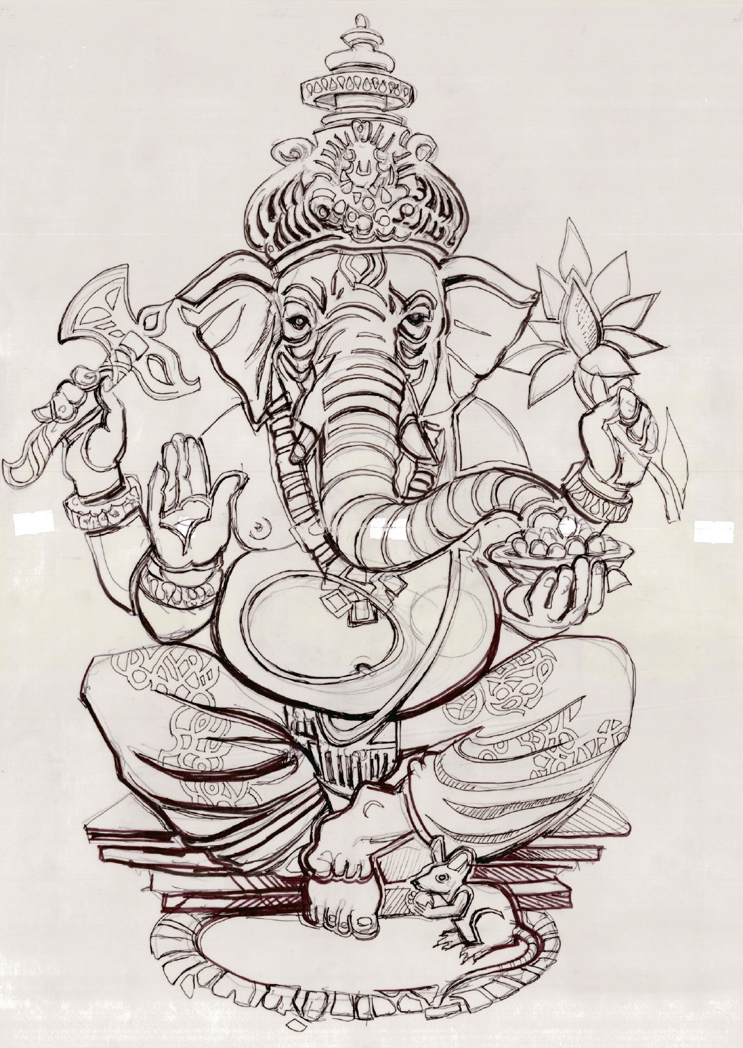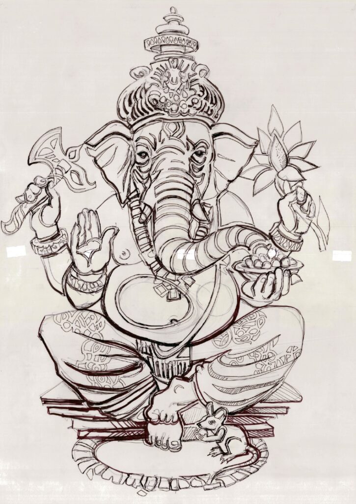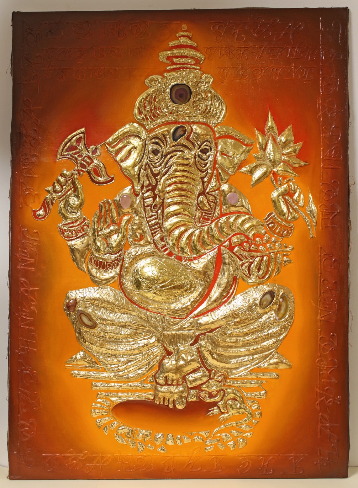 Strukturální malba na plátně pod názvem „Ganéša“ představuje boha se sloní hlavou a vztyčeným chobotem, který symbolizuje štěstí, věrnost, inteligenci a sílu. Součástí obrazu jsou hieroglyfy, vytvořené na základě indického písma brahmí, které vychází z řeči sanskrtu Zadní Indie. Je to originální původní písmo autora Borise Noska, jelikož je tvaroslovím tohoto starého písma pouze inspirováno. Jedná se v podstatě o novotvary, čitelné dle určitého klíče jakožto klasická abeceda – latinka českého jazyka, a tím pádem všechna slova přečte i Čech. Tento klíč, potřebný k dešifrování – analýze a syntéze archetypu – jednotlivých písmen, je v zásadě velmi lehký a záleží na úhlu pohledu, odkud a jak na celá slova nazírat. Jsou zde slova jako síla, štěstí, smíření, harmonie, moudrost, blahobyt, cit, empatie, požehnání a pomoc. Kompozice: Jedná se o centrální vertikální, osově souměrnou kompozici, kde hlavním námětem je sloní bůh Ganéša, který zaplňuje 4/5 formátu. V okrajích se nachází slova tvořená indickými hieroglyfy, připomínajícími písmo brahmí a rámujícími celou kompozici. Výrazy zobrazují zásadní hodnoty lidského života a kompetence Ganéši, které přináší lidem. V postavě Ganéši nalezneme celou řady metafor a symbolů, které vycházejí ze staroindické legendy. Tato kompozice je v podstatě citací tisíckrát zobrazovaného výjevu. Sloní hlava značí věrnost, inteligenci a sílu, jeden kel schopnost překonat veškeré formy dualismu, velké uši symbolizují moudrost a schopnost naslouchat zejména těm lidem, kteří potřebují pomoc, zakřivený chobot schopnost odlišit skutečnost od iluze, symbol na čele umění měřit minulost a budoucnost. Ganéša je zobrazen v tradičním sedu, přičemž jeho nohy ztělesňují důležitost žití i samotného bytí. Levá krajní ruka je rukou ochraňující a bojující, a proto často nese sekyru a má za úkol ničit překážky a vést muže ke spravedlnosti. Druhá levá ruka je rukou žehnající všem lidem a přející klid, mír, štěstí, lásku, ochranu a úkryt a je napřažená prázdnou dlaní dopředu. Pravá zadní ruka nese fantaskní květinu, připomínající leknín, růži, ale i lilii. Právě tato kouzelná květina může symbolizovat duchovní hodnoty – víru, moudrost a kulturu. Přední ruka je naopak pokrčená a nabízí všem věřícím včetně diváka misku s potravou v podobě malých knedlíčků, noků či koláčků. Je to ruka darující blahobyt i materiální zabezpečení, bohatství – ruka, co sytí lidstvo. Plná ruka darů symbolizuje znovuzrození úrody a všech důležitých materiálních potřeb člověka. Čtyři paže slona představují mysl, intelekt, ego a vědomí. U pravé nohy Ganéši je skrčená stylizovaná krysa – tzv. váhana (mytologický přepravní prostředek). Původně byla démonem pýchy, ješitnosti a neomalenosti, který byl bohem poražen. Slouží Ganéšovi dobrovolně a ten se k ní nechová jako k otroku. Ve velkém baculatém břichu slona se skrývá kosmické vejce, které je zde zdůrazněno reliéfem, vystupujícím i přes okraj vejce dále do břicha; zobrazuje celou Mléčnou dráhu – naši galaxii. Vejce může symbolizovat Ganéšu jakožto nositele Brahmandy. Příčně přes tělo a břicho běží velký rudý pás, který je součástí nejen naší galaxie, ale i jeho transferu do naší doby. Ganéša nese na krku velký zlatý řetěz, symbolizující blahobyt, stejně tak jako náramky na jeho čtyřech rukách. Před trůnem je naopak zlaté kamenné hrazení, jež uzavírá v perspektivě určitý ovál, znázorňující čistý a prázdný prostor. Skrývá se zde studnice poznání a velké tajemství. V celém těle Ganéši je ukrytá sym bo lická posvátná geometrie, složená ze dvou symetrických rovnoramenných trojúhelníků, kdy na jejich vrcholech jsou důležité měsíční kameny, mající odedávna astrologický, ale i matematický význam. Kalhoty Ganéši jsou pokryty archaickým filigránským ornamentem, symbolizujícím vzácnou látku a tudíž jeho vysoký božský původ, bohatství a věčný mír. Barevnost je držena ve žluto-oranžovo-rezavo- -hnědých tónech. Určité artefakty jsou pomalovány červenou až karmínovou barvou a zejména tomahawk a okolí lotosového květu obsahují rumělku i kraplakovou červeň. Taktéž ve středovém pásu, obtáčejícím diagonálně celou postavu, pulsuje karmínová červeň, připomínající tekoucí životodárnou krev, ale i krev země – lávu, která pochází ze srdce naší planety. V celém obraze převládají teplé tóny a taktéž zlatá místa, kterými jsou polychromované všechny strukturální a reliéfní části plastiky. Pouze v okrajích je neutrální hněď, v níž se též nachází již výše zmíněné hieroglyfy. Právě v přechodu ze zářivě žlutých až po hnědou se hieroglyfy částečně ztrácejí, ale z určitého úhlu naopak vystupují díky svému lesku a vysokému reliéfu. Celá kompozice působí jednotným a pozitivním dojmem teplé barevnosti a kromě pár neutrálních, temně hnědých detailů z něj vystupují pouze efektní zlatá místa a několik polodrahokamů. Kameny symbolizují nejen kosmické vejce, ale i určité planety galaxie a věčné universum, symbol zrození a věčné trvání. Tento obraz patří k několika málo námětům Borise Noska, kdy se autor přiklání k důstojné citaci už tak výrazně stylizovaného motivu, jelikož sloní bůh je v podstatě mutant dávné mytologie, mající své přesné proporce, parametry a nesoucí tradiční hodnoty. Jakákoliv autorská stylizace – ať už k nadsázce kubistické, geometrické či jiné – v tomto případě nebyla na místě. Přestože je vlastní výjev ve svém technologick
