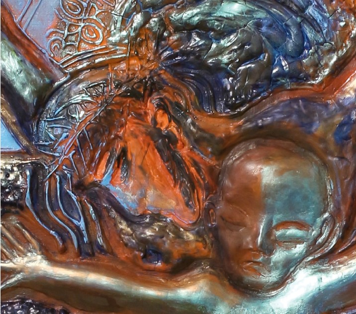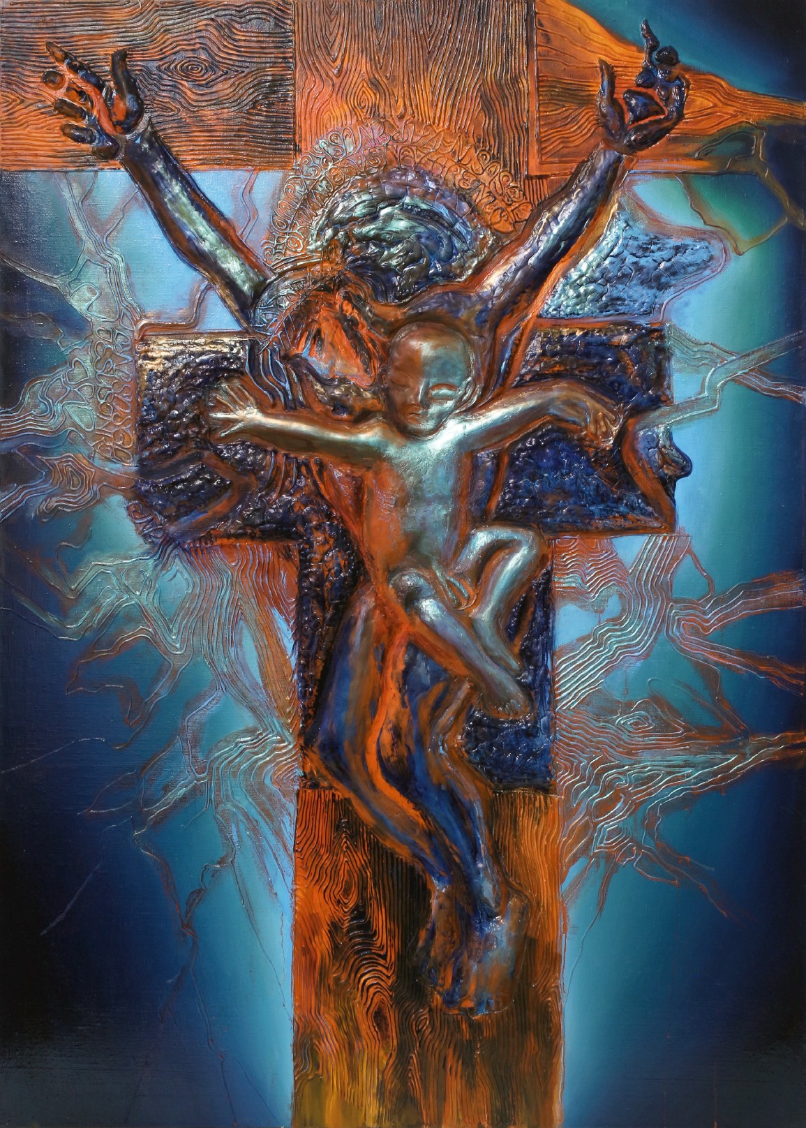 Námět: Pozitivní energie se dere ze všech míst na diváka tak, že působí jako výrazné memento, které se zapíše do jeho mysli i srdce. Zde nestačily autorovy klasické malířské prostředky, se kterými se běžně pracuje při tvorbě obrazu. Takzvaná 2D splývavá technika a renesanční šerosvit, budovaný na základě jemných lazur. Naopak, využívá bohatě reliéfu, který je naléván injekčními stříkačkami, budován noži a špachtlemi z latexosádrové hmoty do zásadní kompozice. Leitmotivem se zde stává kříž – téměř pravoslavný – ze kterého je vidět větší část kompozice; končí horním břevnem, které je v pravé části zalomeno. Autor předkládá divákovi metaforu k zamyšlení, kdy se kříž coby symbol víry postupně láme stejně tak, jako odpadávají nepravé ovečky (věřící) od svého stáda. Z pravého horního břevna zbývá jen pahýl. Je to metafora na současný stav duchovního života jak prostých lidí, tak církevních hodnostářů v celém světě. Ti skutečně pravověrní a silní ve víře zůstávají v menšinách, sdružují se do komunit a sborů a bojují s nezájmem, necitlivostí a otupělostí. Přesto však se rodí noví a vzácní lidé, rodí se děti, naděje celého lidstva, které jsou možná předurčeny k vedení a pokračování opravdové víry, a tak příběh, který je v prvním plánu čitelný, dostatečně historicky prověřený a známý, je zde u autora transformován do jeho vlastní vize, jež je o něco složitější, ale o to intimnější. V centru vlastního obrazu se nachází malý Ježíš – Jezulátko – s roztaženými ručkami, kdy se levou rukou opírá o vlastní zavinovačku. Rozvinutý povijan též vytváří kompozici menšího kříže, umístěného na kmen (břevno) velkého kříže, nesoucího umírajícího Krista. Polštářová část je ozdobená krajkou, skrývající tajemství. Tvoří zároveň jakousi auru i svatozář, která se propojuje s hlavním trámem velkého kříže a vlastní figurou dospělého Krista. Ač se jedná o zobrazení v klasické pozici, kdy je tělo Krista přibito na kříži s nohama u sebe, právě zde jsou ale Kristovy ruce rozpražené do kompozice „V“ a připomínají tak vítězství nad sobectvím, zlem a nenávistí. V těchto pozicích autora nejvíce inspirovala kompozice Josefa Václava Myslbeka, kdy měl autor možnost sledovat jeho Krucifix v podstatě každý den v Ateliéru volné grafiky na pražské AVU. Obrovská síla, která i po staletích plyne z tohoto námětu, dala autorovi poselství a v podstatě i záměr vyjádřit celou věc v novém podobenství. Jedná se o velký posun, kdy autor s pokorou vytváří kompoziční citaci na mnohokrát ztvárněný výjev – od starých gotických kalvárií a krucifixů v čele s Giottovým ukřižováním a z českých zemí Mistrem vyšebrodského oltáře, přes renesančního Michelangelova Krista, ale i Donatellovy a barokní podoby Braunovy, Brokoffovy nebo Berniniho – v klasickém pojetí. Na paměti má však i moderní ztvárnění a kubistické či surrealistické parafráze Bohumila Kubišty či Salvatora Dalího, Gauguinova Žlutého Krista nebo Chagallovy židovské ilustrace Starého zákona – to vše prolétá hlavou před zavřenýma očima každému zodpovědnému autorovi. A právě s respektem k historii chce autor své pojetí udělat úplně jinak. V případě Myslbeka je inspirován snad i jistou citací – připomínkou jeho kompozice v celé vážnosti a s úctou a s respektem adorovat to nejlepší, co v této soše přetrvává. Barevnostní uchopení a zcela nové spojení s malou figurou Ježíška posouvá námět naprosto do jiné sféry. Malý Ježíš je symbolem lásky muže a ženy – jejím vrcholným plodem. Proto tedy témata lásky a milosrdenství mohou symbolizovat jak lásku pozemskou, ale i boží a Kristovu ke všem lidem. Tato láska se stala nositelem největší oběti, kterou může člověk – syn boží – dát za nás, za lidstvo, naše osudy, hříchy a chyby a v podstatě i za naše srdce i duše. Je to největší, čistá láska, která září i na kříži. Ačkoliv krvácí, přesto umírá smířen s nadějí a s láskou, že celý jeho krátký život nebyl zbytečný a měl smysl. Umírá s vědomím, že lidstvo jeho poselství a učení bere vážně a bude v něm pokračovat. Malý Ježíš také vzdáleně připomíná ukřižovaného na svém povijanu, kdy se jednou rukou opírá o pomyslného otce v pozadí – o své podobenství, své starší alter ego. Zvolna hýbe celým tělem i pokrčenými nožkami, jež vytvářejí protikompozici k dlouhým končetinám Krista. Velký Ježíš má nohy umístěné tradičně v malém prohnutí, vertikálně směřující špičkami k dolnímu okraji formátu, a ruce jsou naopak, jak bylo řečeno, do písmene „V“ a směřují do levého a pravého rohu obrazu. Tyto dva náměty srůstají do jednoho celku právě v srdci obrazu, které krvácí, ale současně i září. Malý Ježíš je tak smířen se svým osudem, který mu byl dán. Tváří se zasmušile a vážně – smutné oči má zavřené a sní o lepší budoucnosti. Tato esence dítěte se ve své genezi po 33 letech blíží svému cíli, kdy naplňuje své poslání svou prací pro lidstvo. Je jakousi metaforou lidského života – útrap a nesnází, ale i nadějí a radostí, výher i zklamání, těžkého života, který je velkou zkouškou, a ne každý v ní obstojí. Ale jedině s vírou, opravdovou láskou a milosrdenstvím má smysl bojovat.