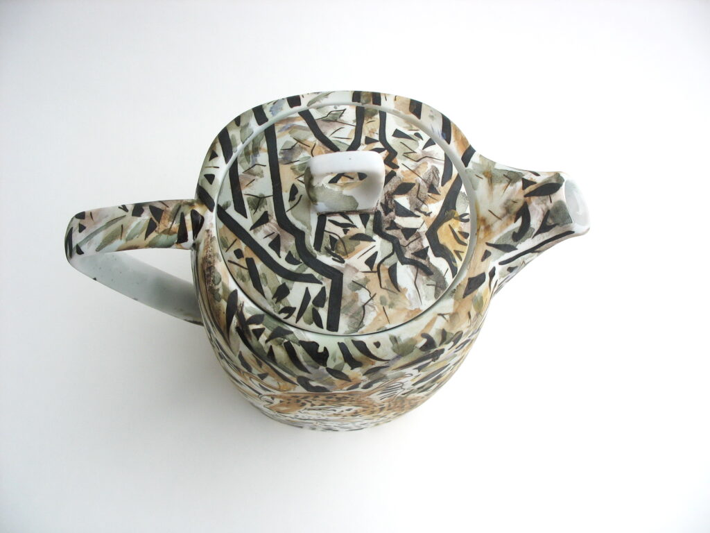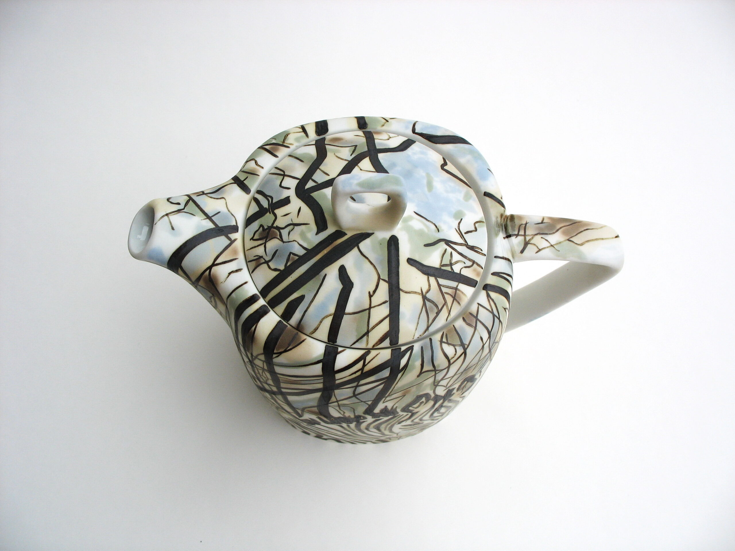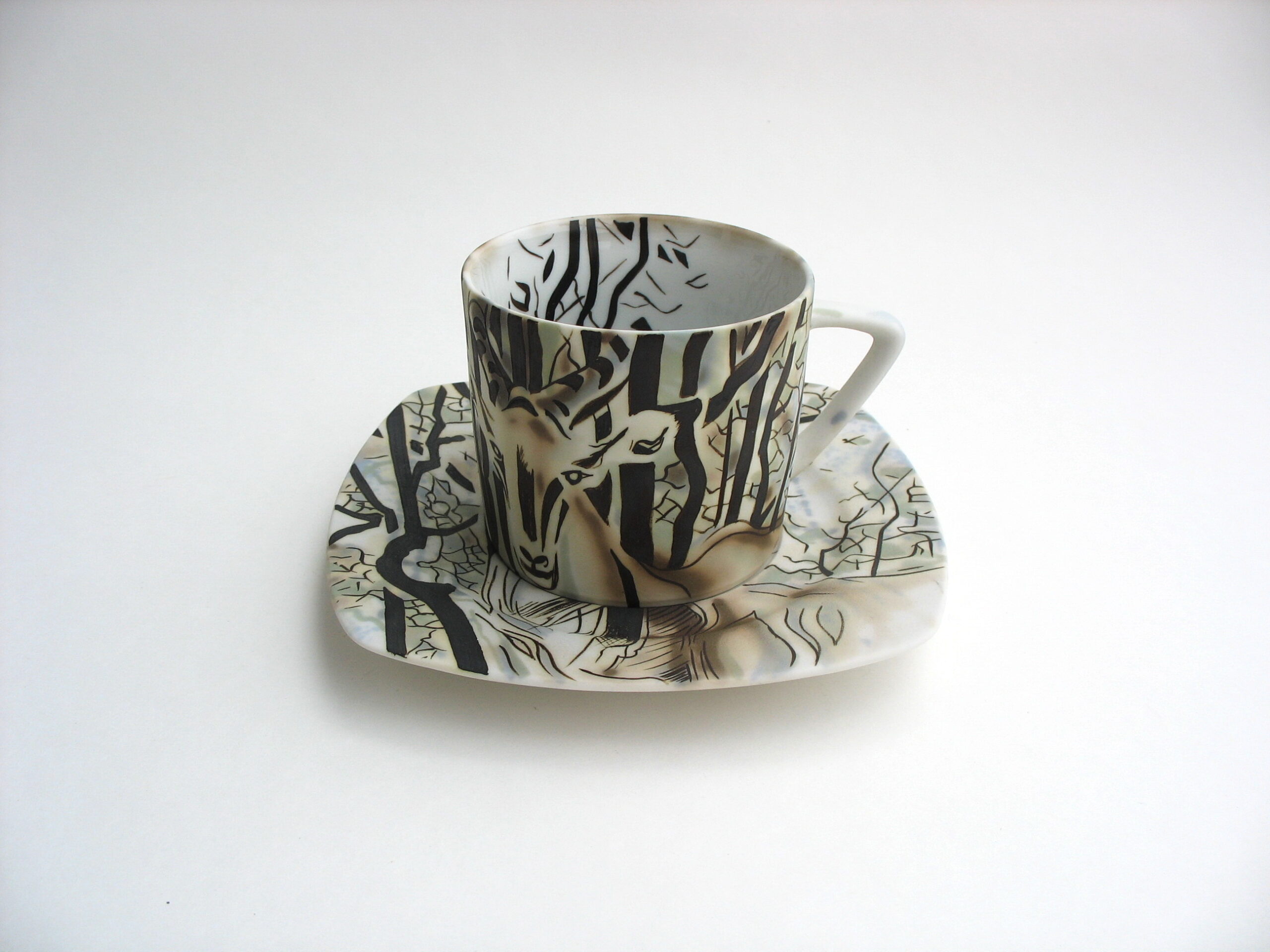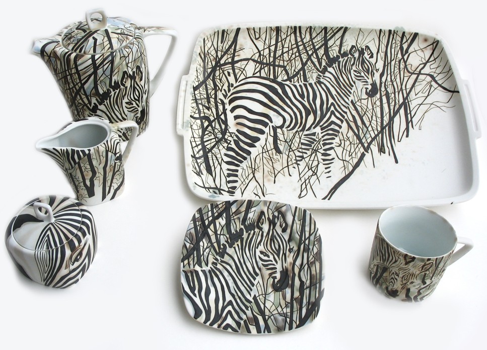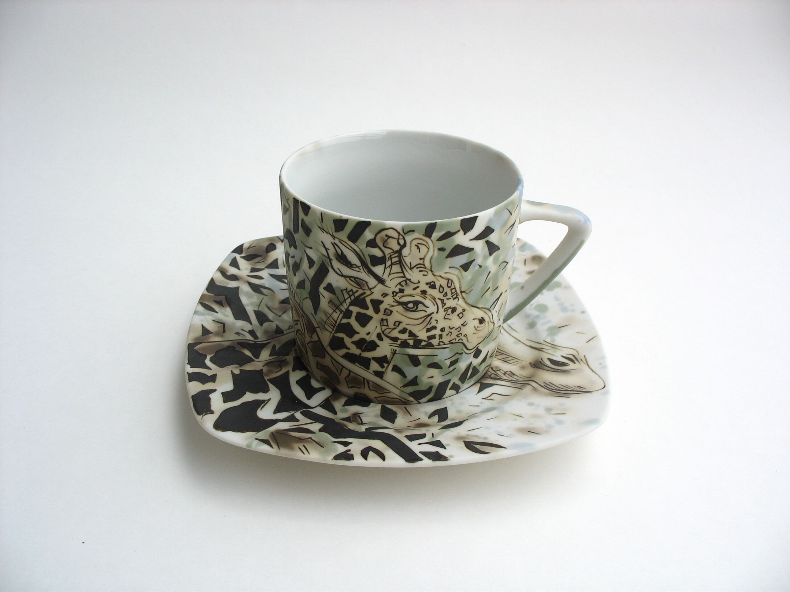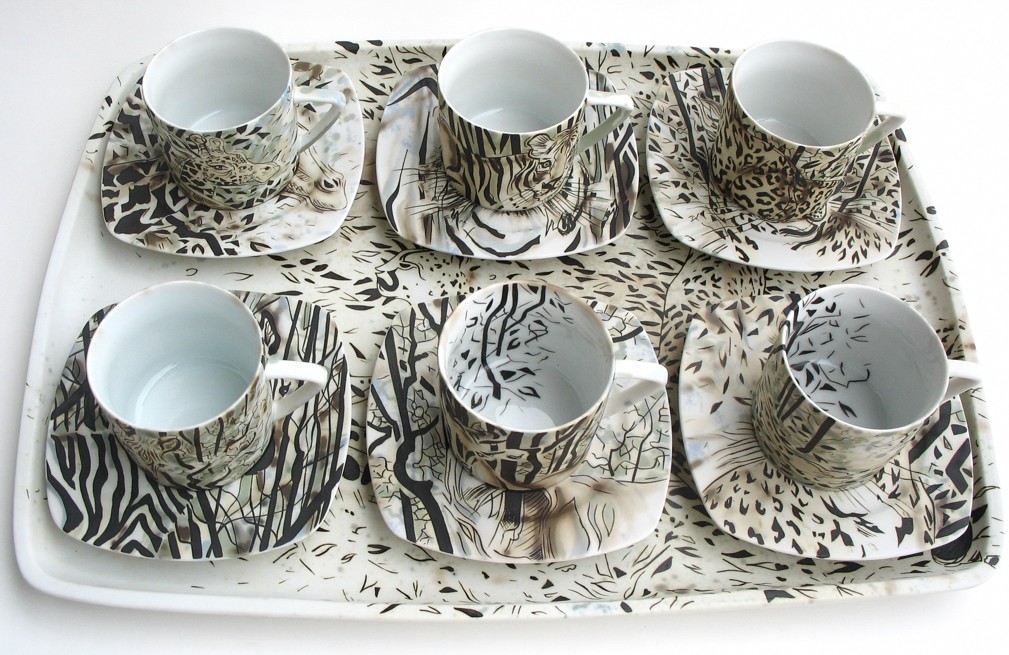 Porcelánový servis „Mimikry I“ Mimikry, Porcelán Technika: biskvit, vtavné barvy a sole. Kávové a přátelské soupravy. šálek 1,5dcl a podšálek pr. 14cm konvice kávová 3,5dcl podnos 43x30cm cukřenka mlékovka 1,25dcl All