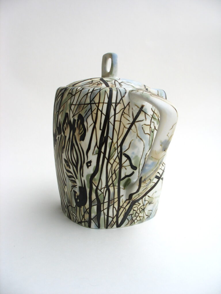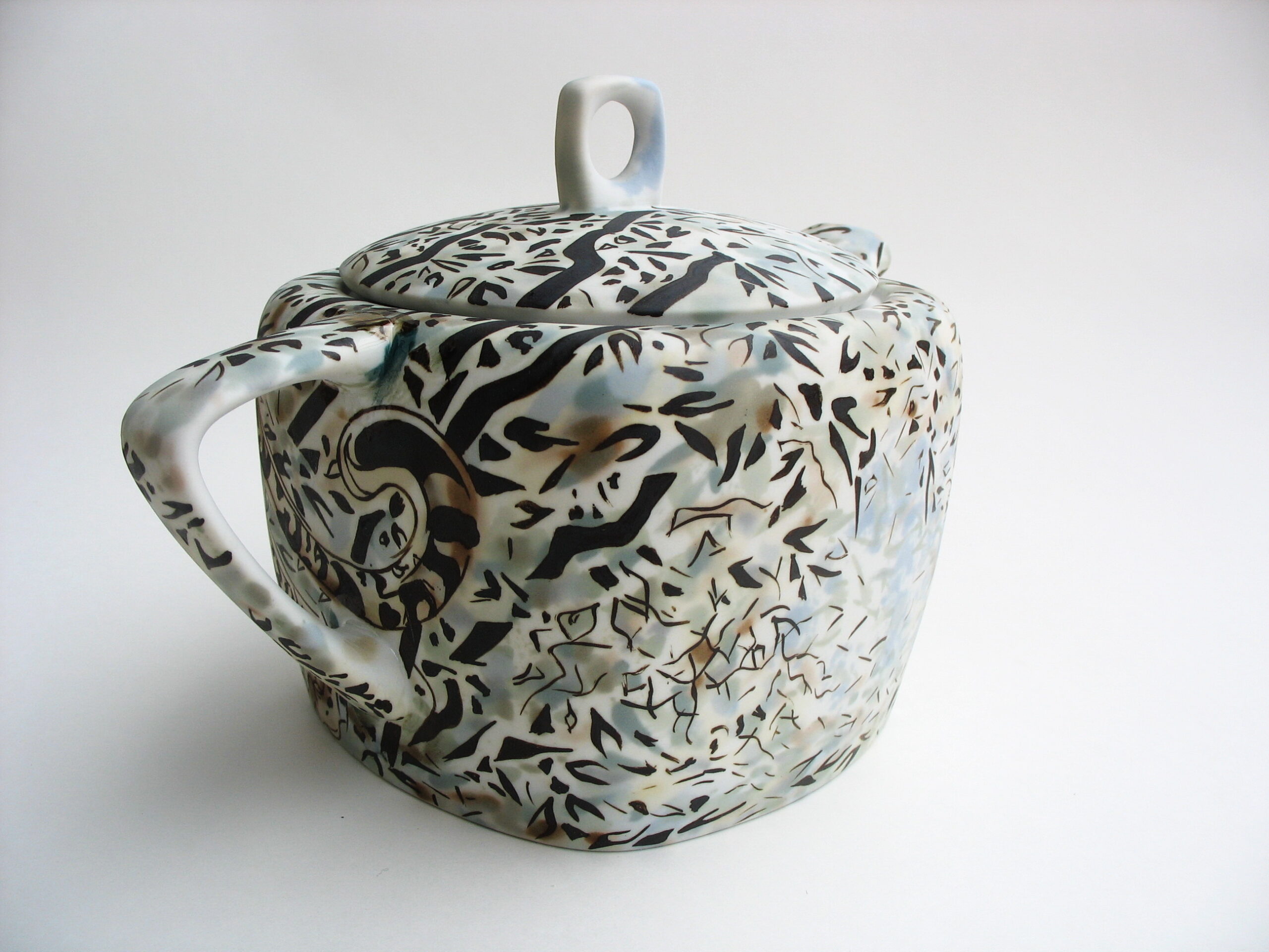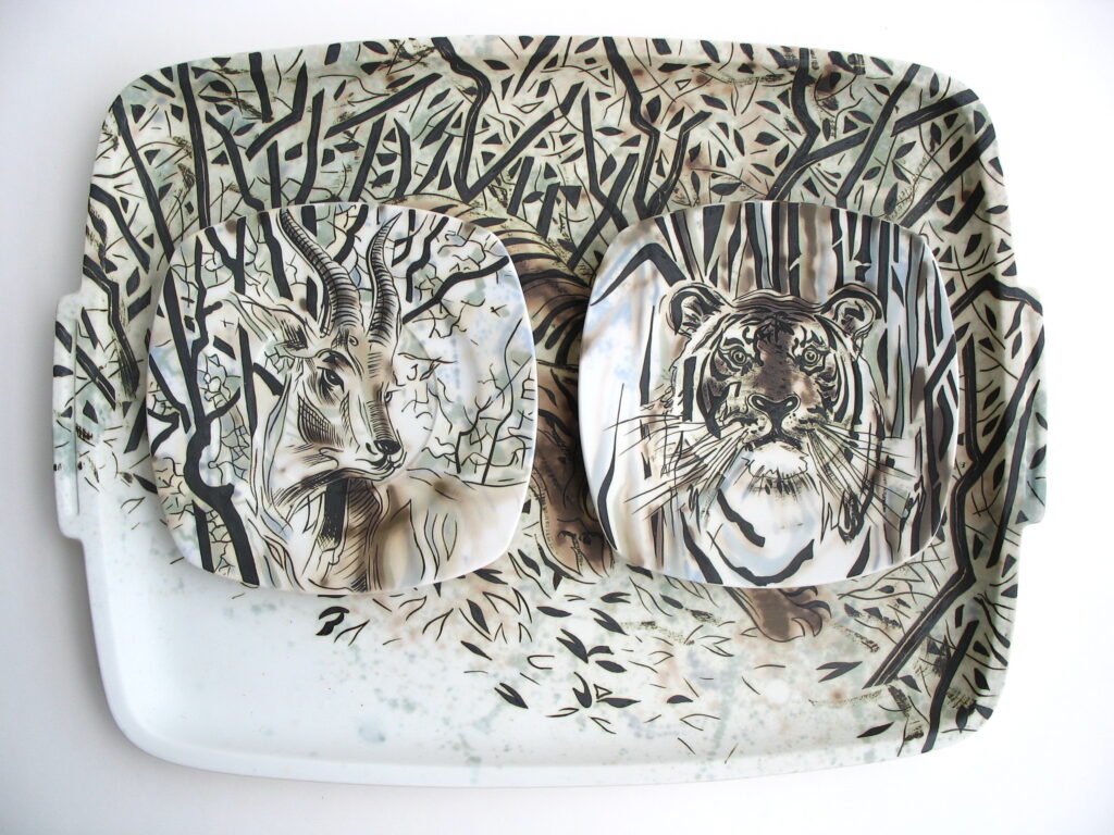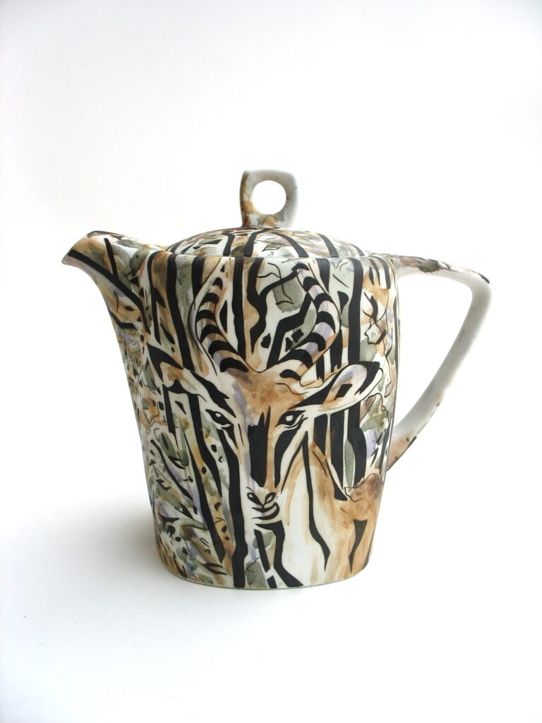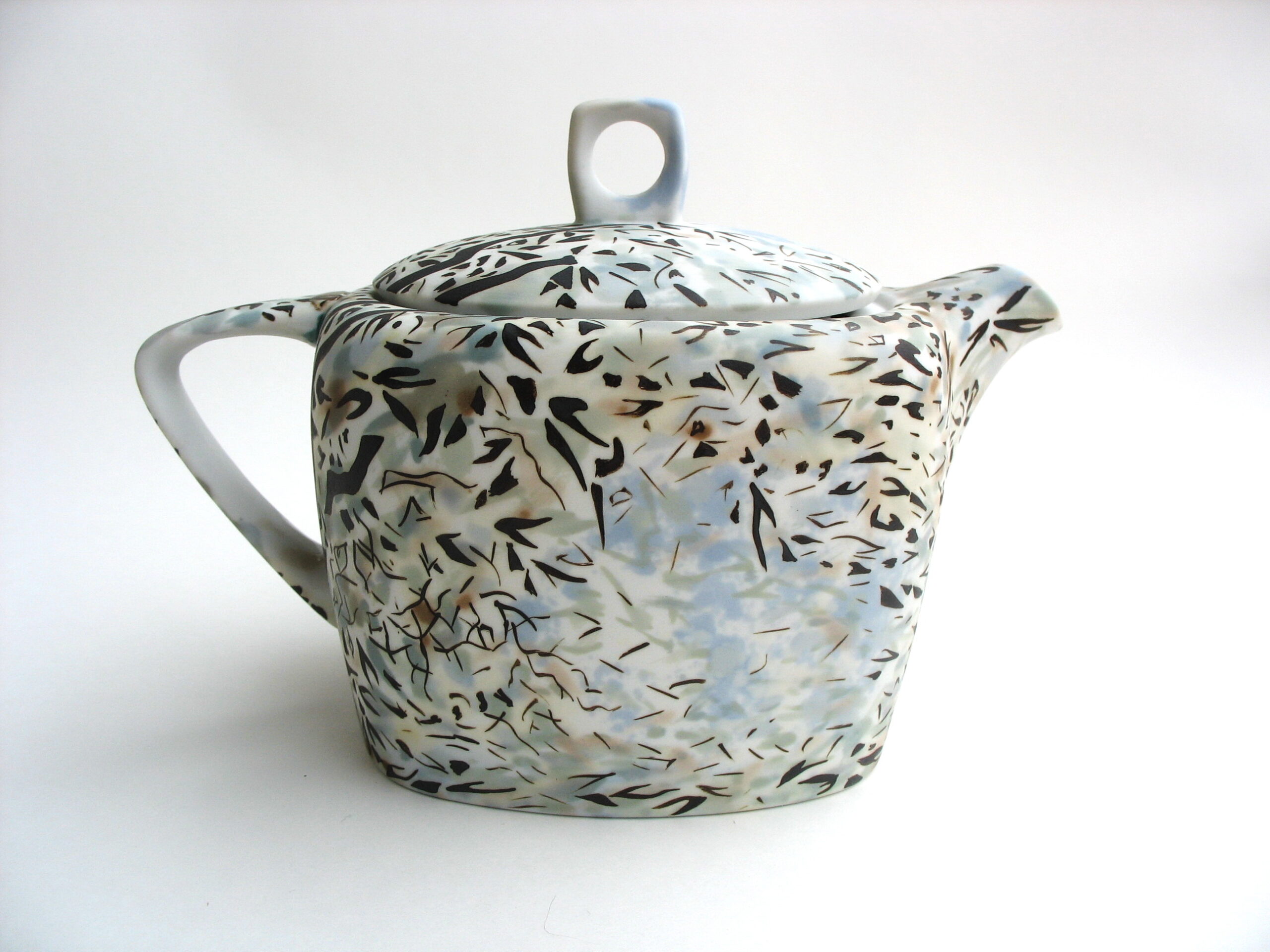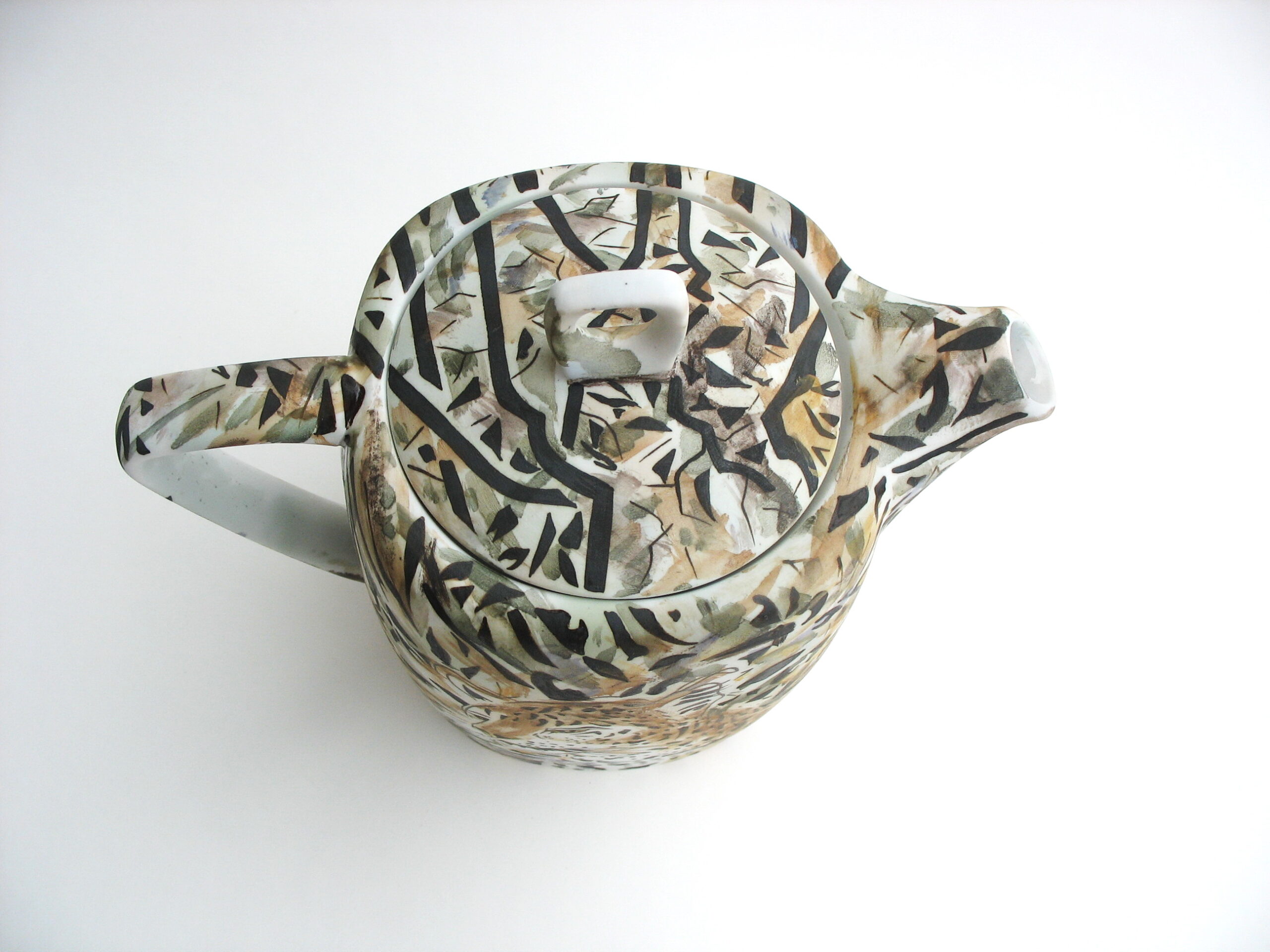 Porcelánový servis „Mimikry I“ Mimikry, Porcelán Technika: biskvit, vtavné barvy a sole. Kávové a přátelské soupravy. šálek 1,5dcl a podšálek pr. 14cm konvice kávová 3,5dcl podnos 43x30cm cukřenka mlékovka 1,25dcl All