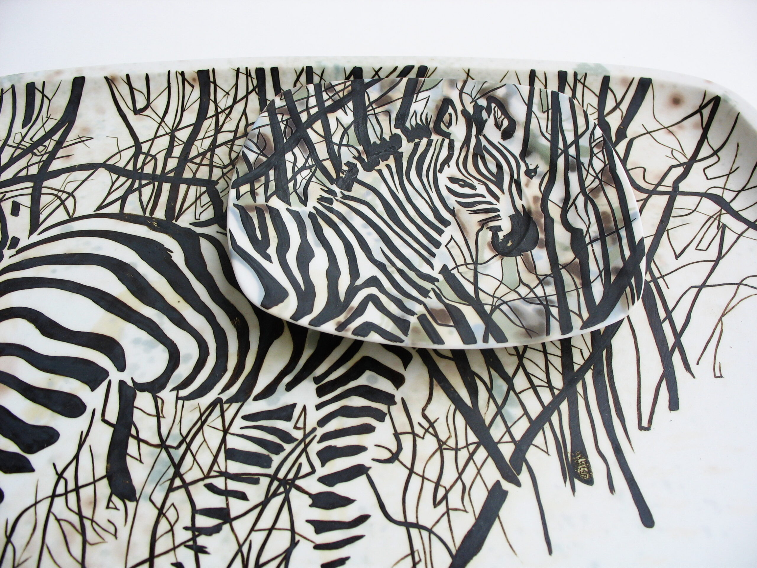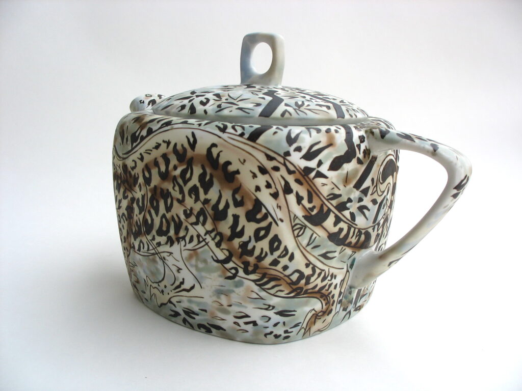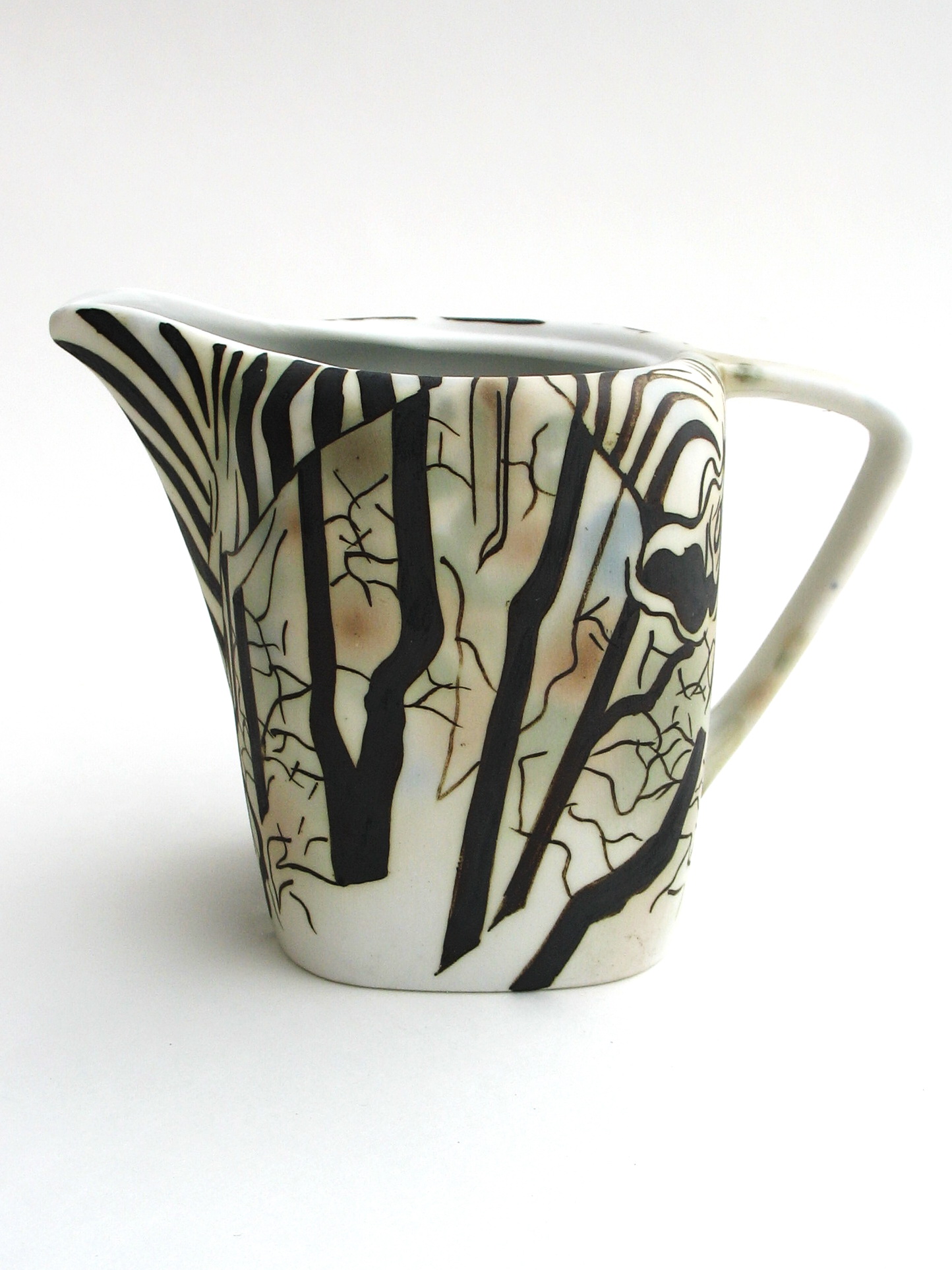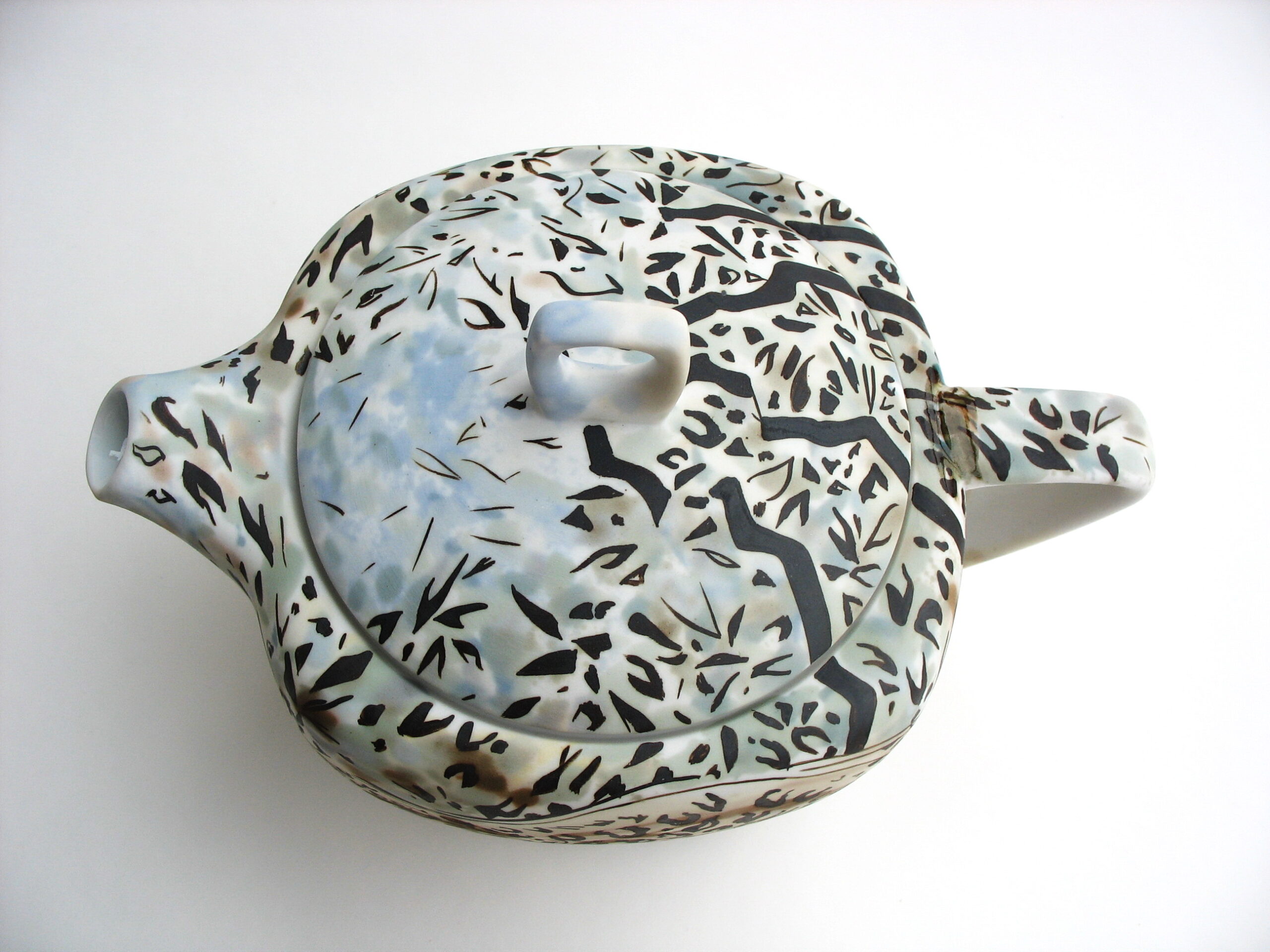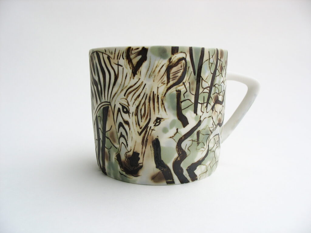 Porcelánový servis „Mimikry I“ Mimikry, Porcelán Technika: biskvit, vtavné barvy a sole. Kávové a přátelské soupravy. šálek 1,5dcl a podšálek pr. 14cm konvice kávová 3,5dcl podnos 43x30cm cukřenka mlékovka 1,25dcl All