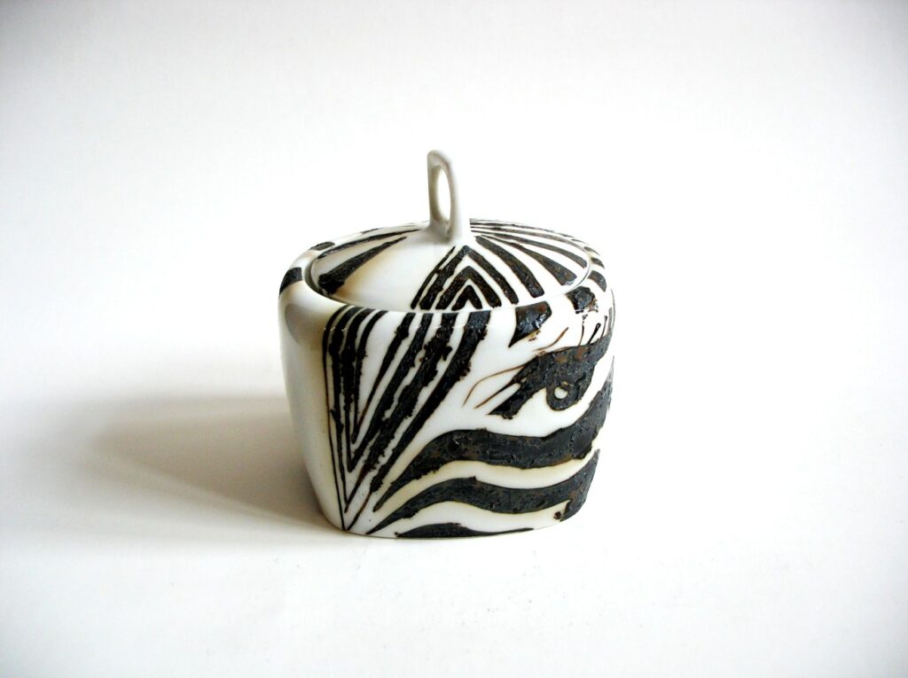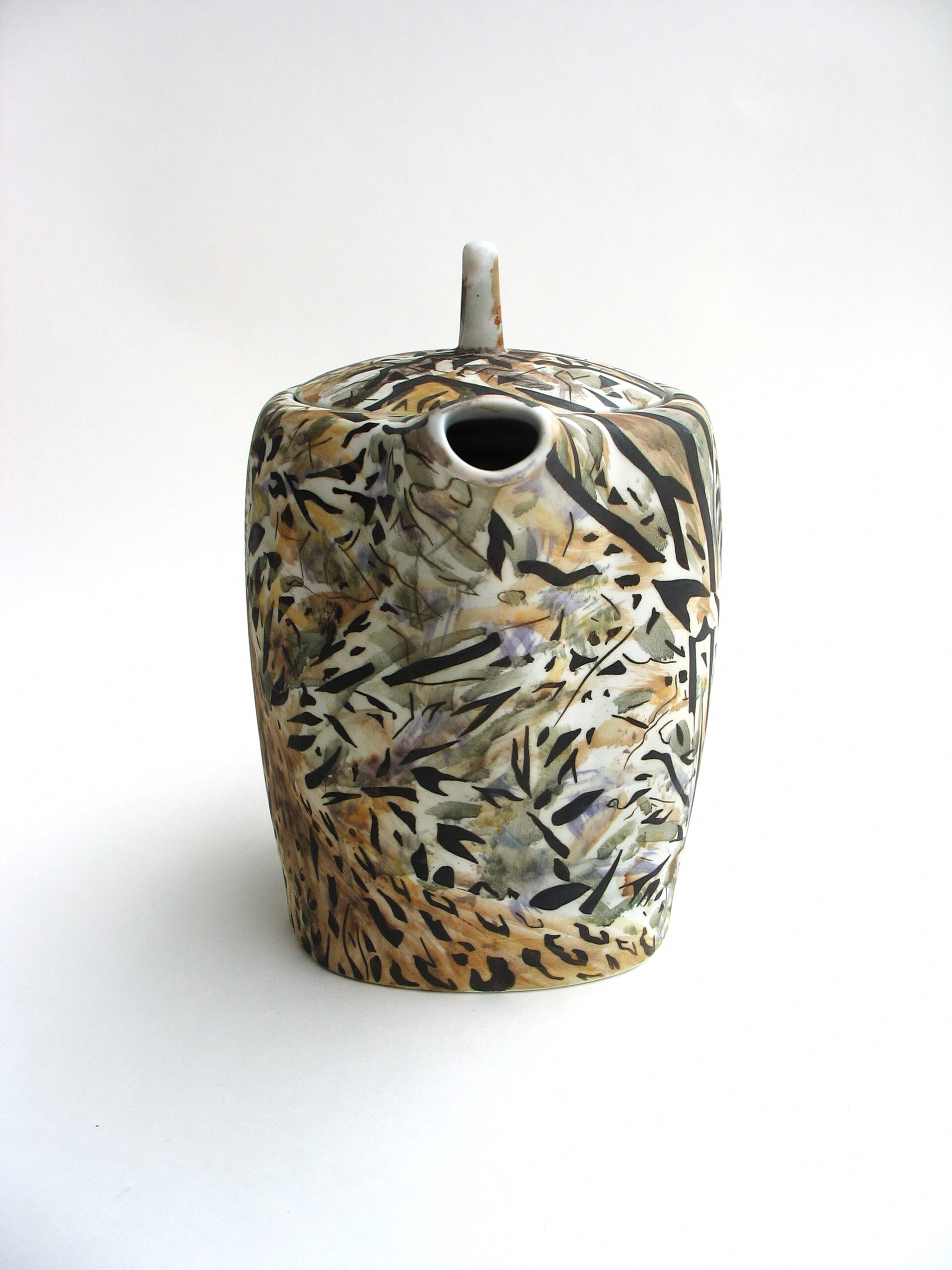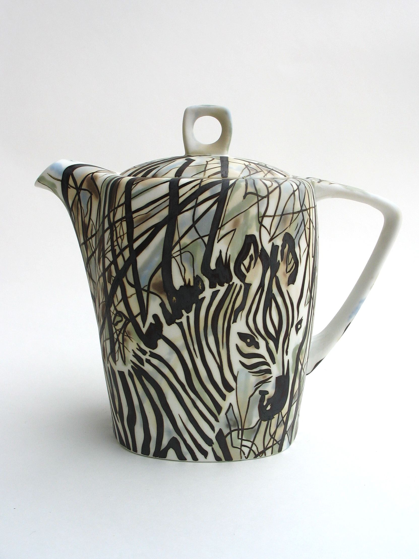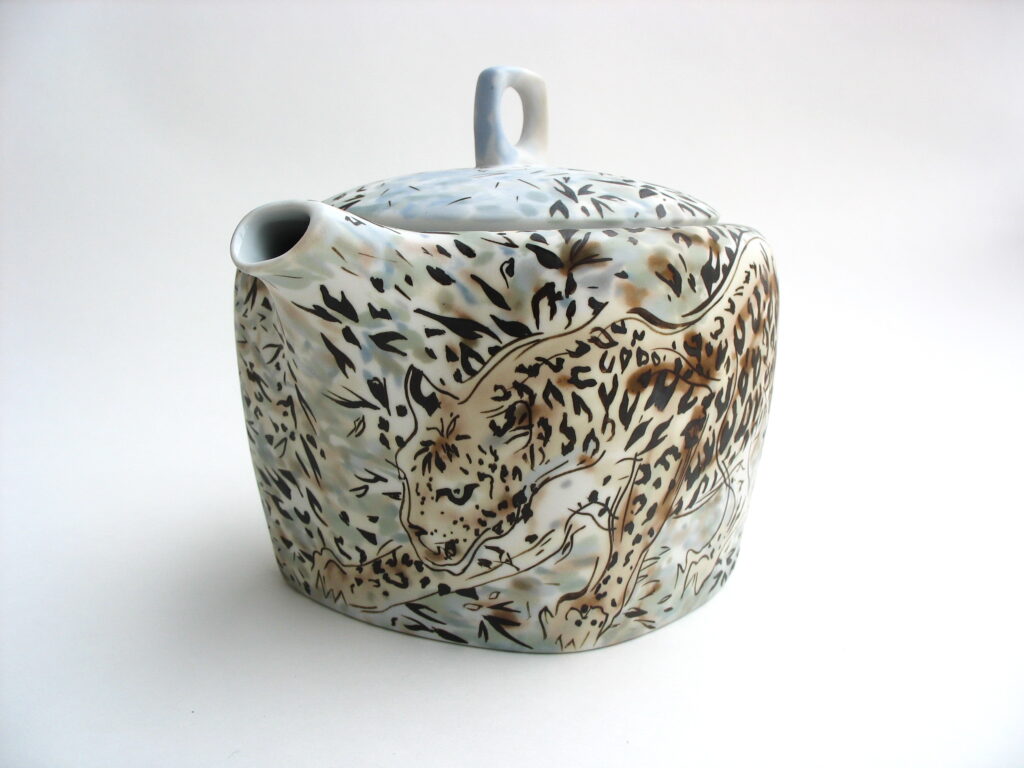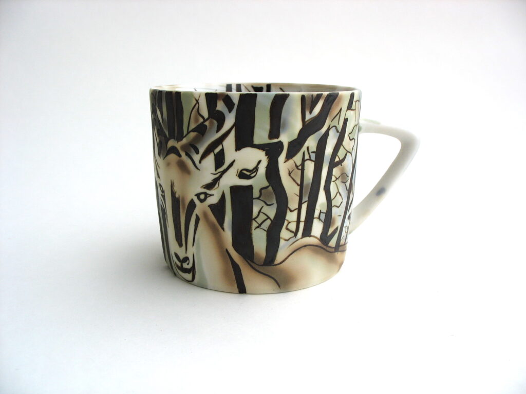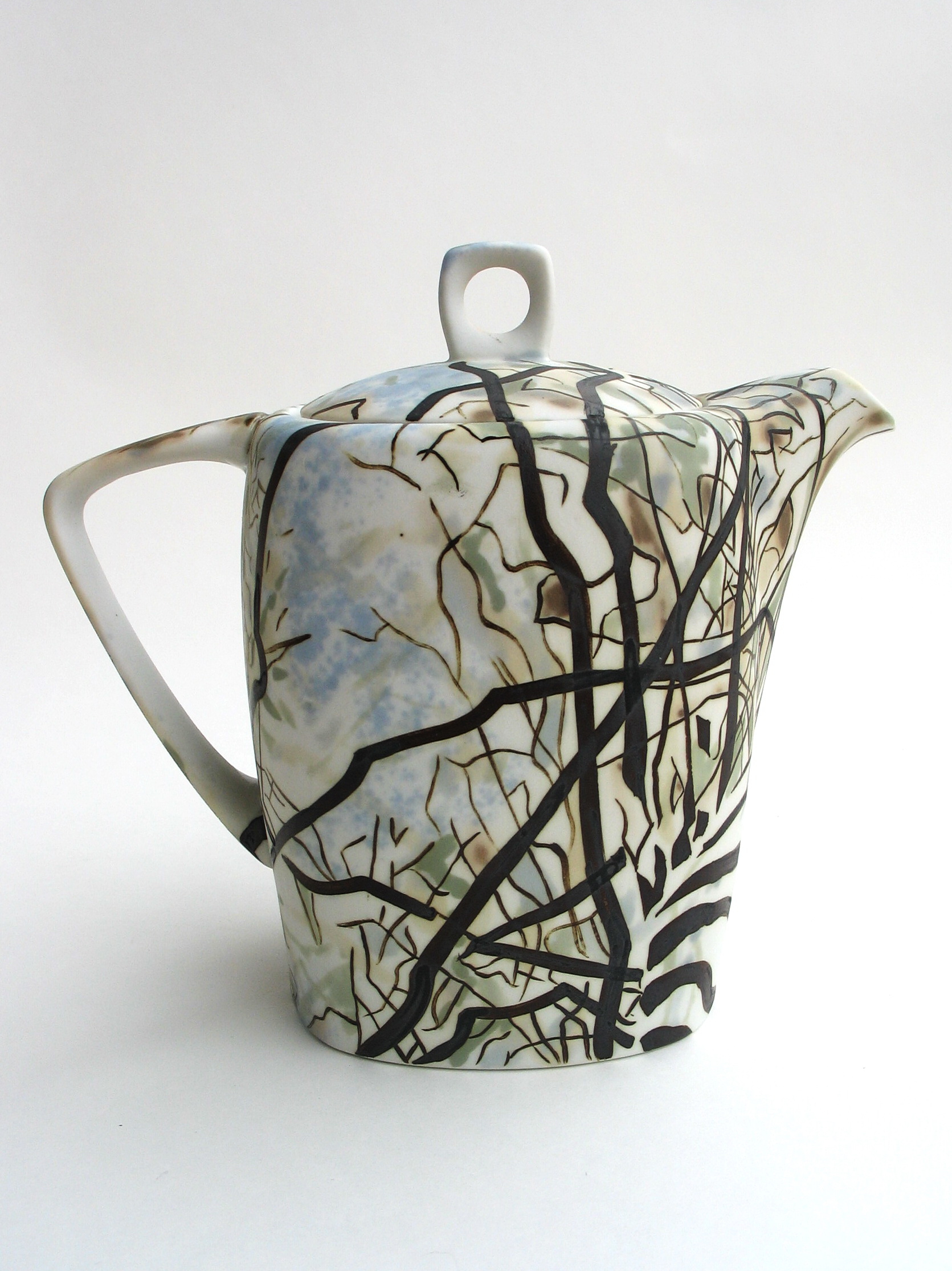 Porcelánový servis „Mimikry I“ Mimikry, Porcelán Technika: biskvit, vtavné barvy a sole. Kávové a přátelské soupravy. šálek 1,5dcl a podšálek pr. 14cm konvice kávová 3,5dcl podnos 43x30cm cukřenka mlékovka 1,25dcl All