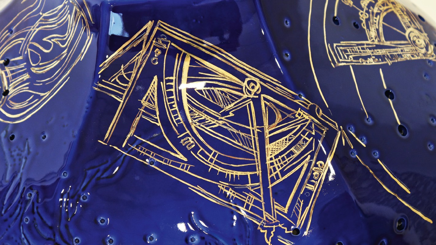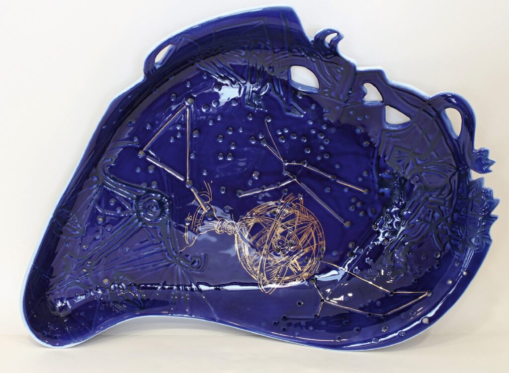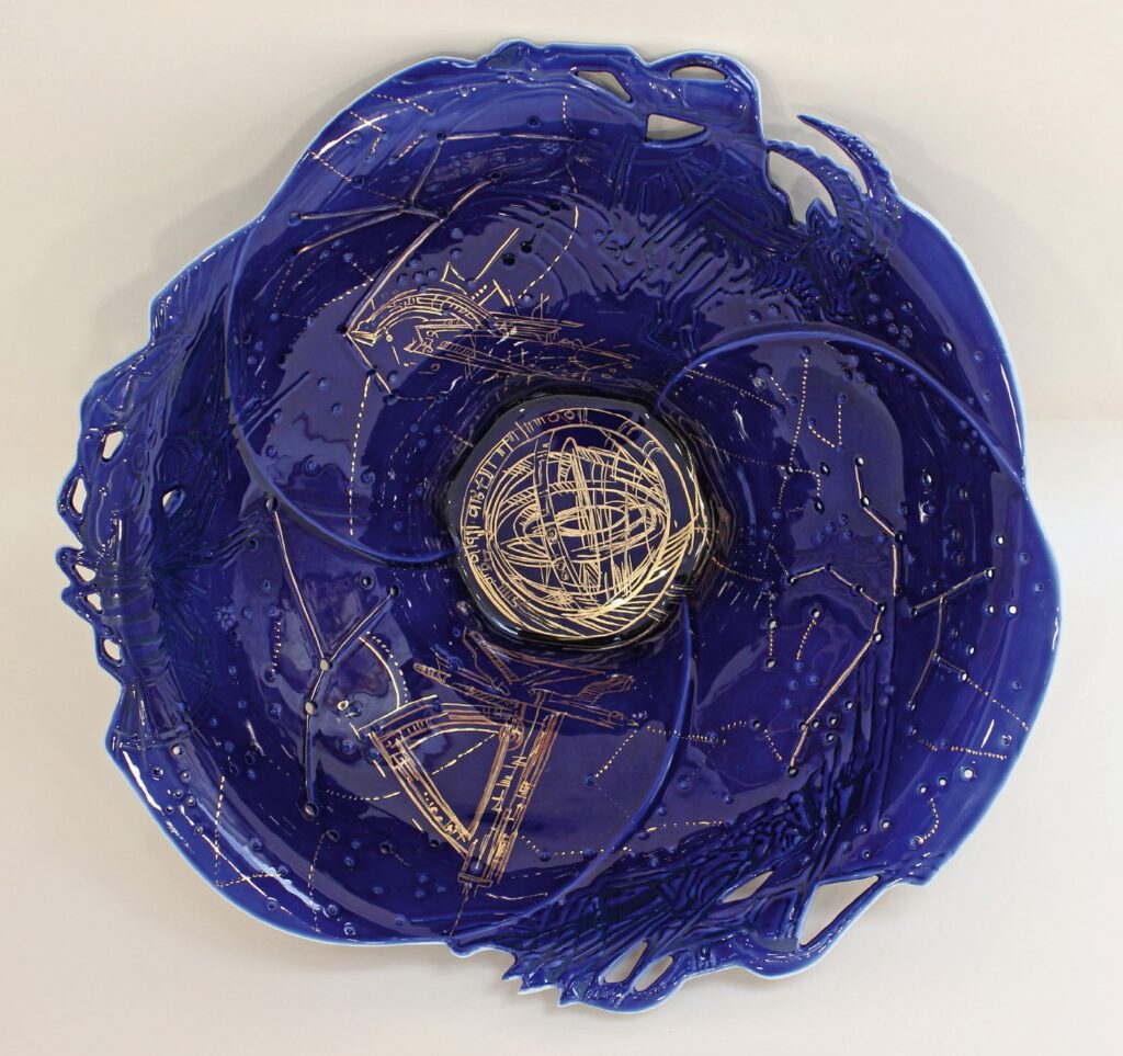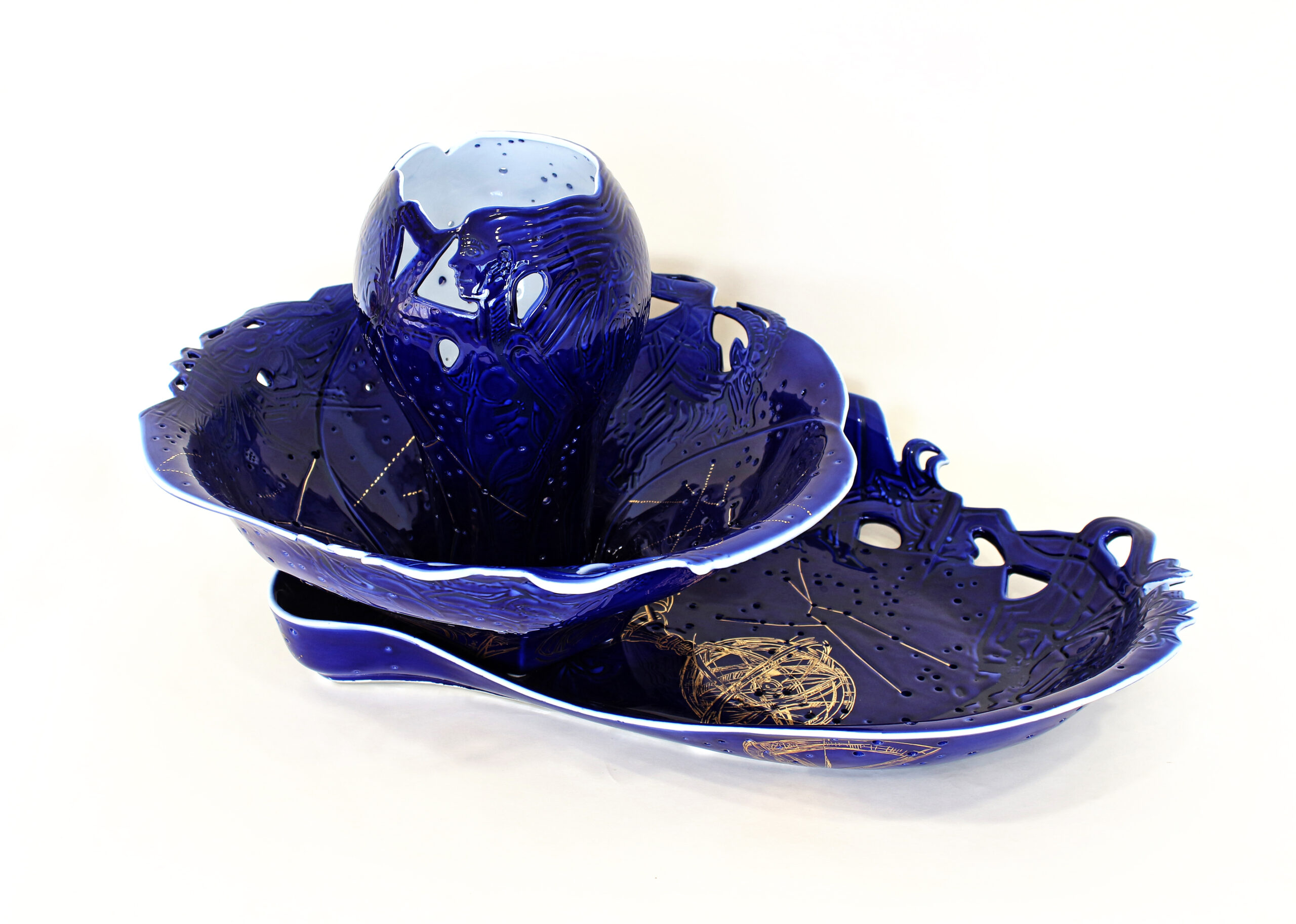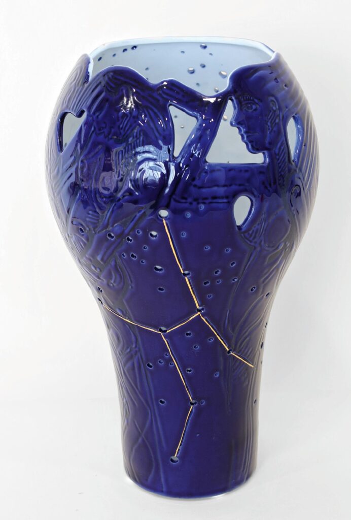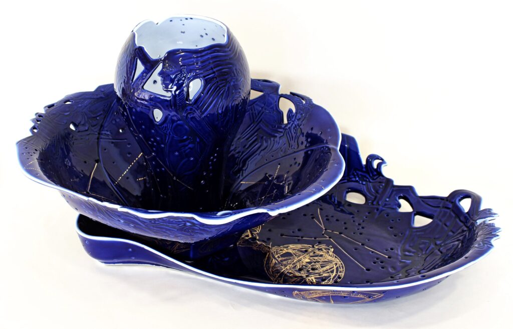 Technologie: glazovaný porcelán, horký vosk – basreliéf; malba kobaltem pomocí airbrushe; zlato, platina; prořez vysokofrekvenční frézkou, otvory vytvořené vrtačkou (hvězdná obloha); páleno na 820 °C.