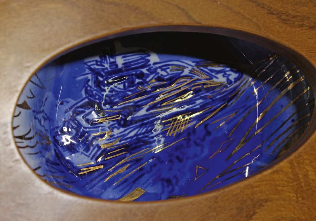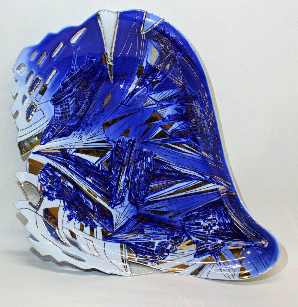 Technologie: páleno na 5 výpalů. Výpal na 1400 °C, porcelán, kobalt, dekorativní výpal na 820 °C – zlato, platina, vitráž, sklo, olovo, cín.