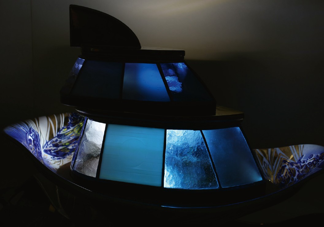 • „velká kajuta“ (28 × 12 cm; vitráž: pískované sklo, korek)