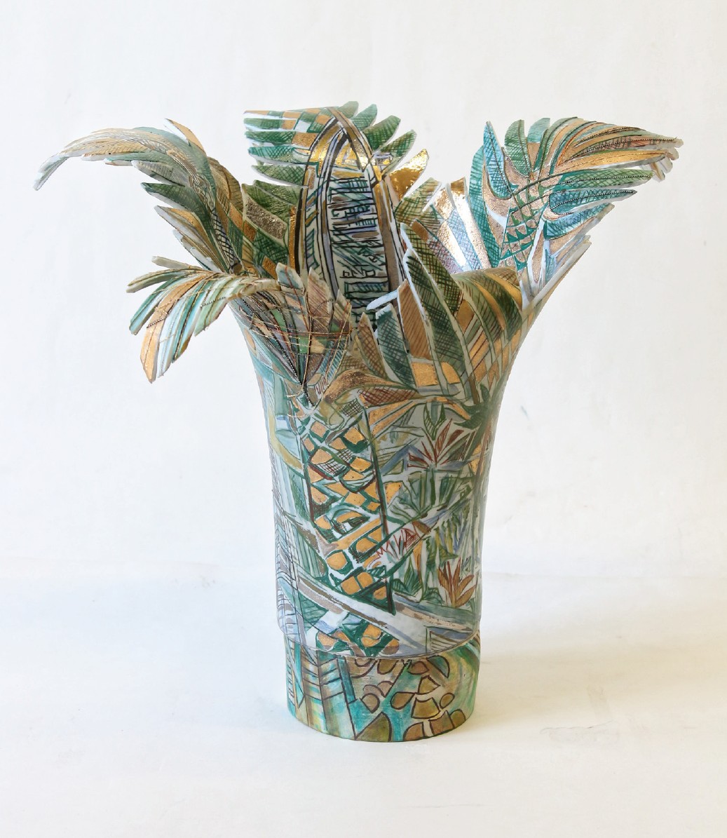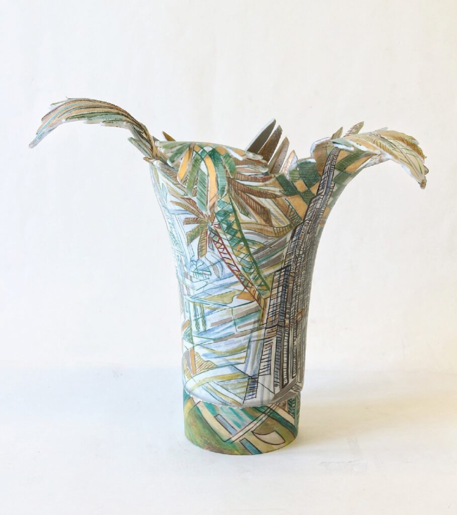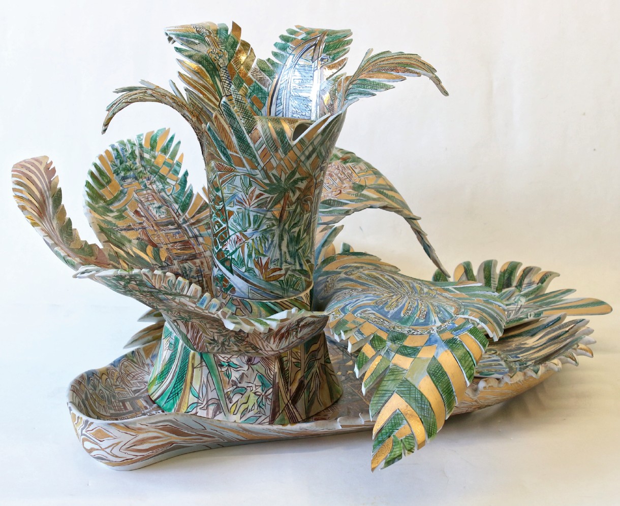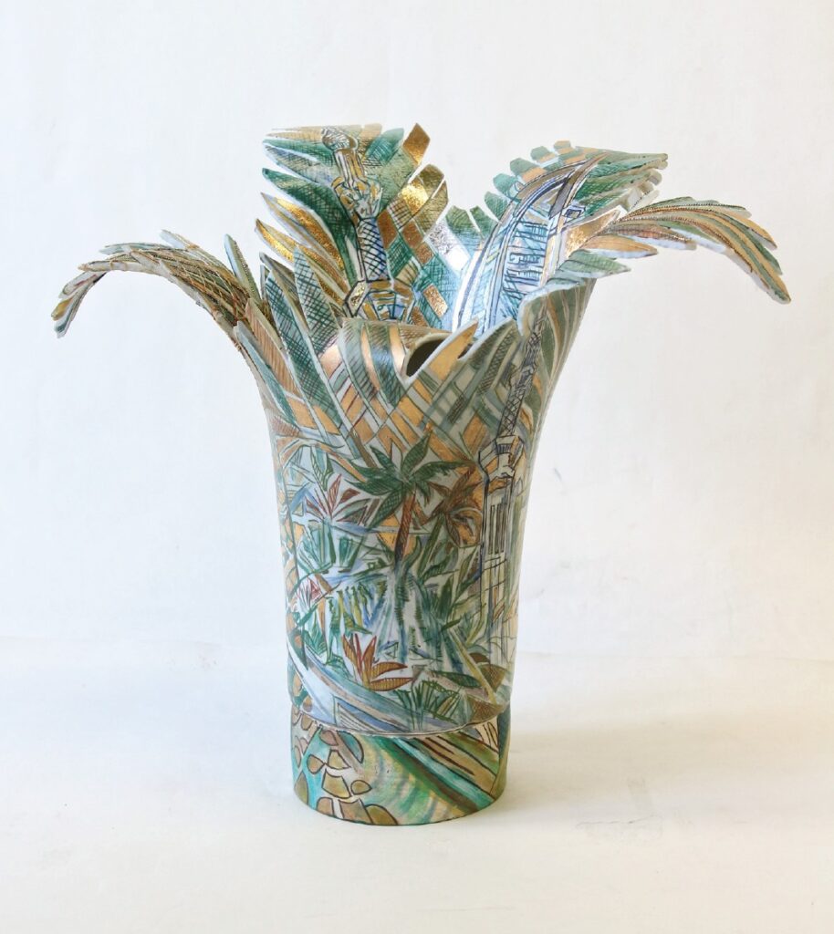 Všechny tři prvky triptychu „Palmy – stromy slunce“ jsou vytvořené z vysoce kvalitního českého kaolinu páleného na biskvit (bezglazurový porcelán). Hluboká mísa i váza jsou umístěné na speciálních keramických soklech. Triptych je poctou palmovým stromům, tropické vegetaci a přírodní i architektonické rozmanitosti Arabského poloostrova. Kompozice všech tří děl vizuálně propojuje motivy přírody s významnými stavbami Blízkého východu. Na objektech jsou citlivě zachyceny ikonické stavby jako Burj Khalifa (nejvyšší mrakodrap světa), hotel Burj Al Arab ve tvaru plachty, umělé ostrovy Palm Jumeirah v podobě rozvětvené palmy, nádherná Jumeirah Mosque či impozantní Velká mešita šejcha Zaída v Abú Dhabí. Kromě architektury jsou do detailů vykresleny motivy oáz, pouštních dun, jeskyní a dalších přírodních jevů Arabského poloostrova, což dohromady vytváří obraz krajiny tepla, života a duchovní hloubky. Každý objekt prošel zcela ručním zpracováním – výrobou, tvarováním a detailním prořezáváním listových motivů vysokofrekvenční frézkou. U vázy byly jednotlivé listy za syrova tvarovány oproti ostatním vázám směrem ven. Hluboká mísa je rozdělena na jednotlivé listy, do kterých jsou zakomponovány architektonické zázraky i přírodní detaily, kde dlouhé třásňovité výběžky evokují tropické listoví. Mělká mísa v sobě nese nejen příběh palmy, ale i fragmenty arabských staveb a pouštní krajiny. Unikátem je, že při výrobě byly použity i reliéfní fragmenty vzniklé technickou náhodou (uvolnění kousku listu při prořezu), které byly při výpalu přirozeně včleněny zpět a propojeny glazurou v jednotný celek.