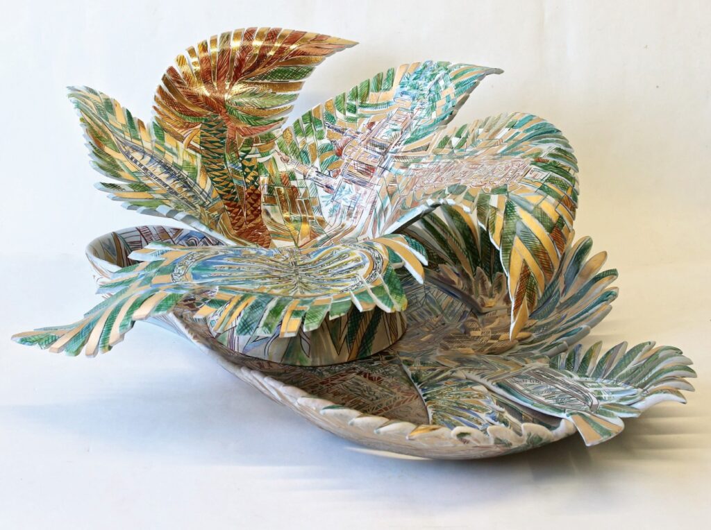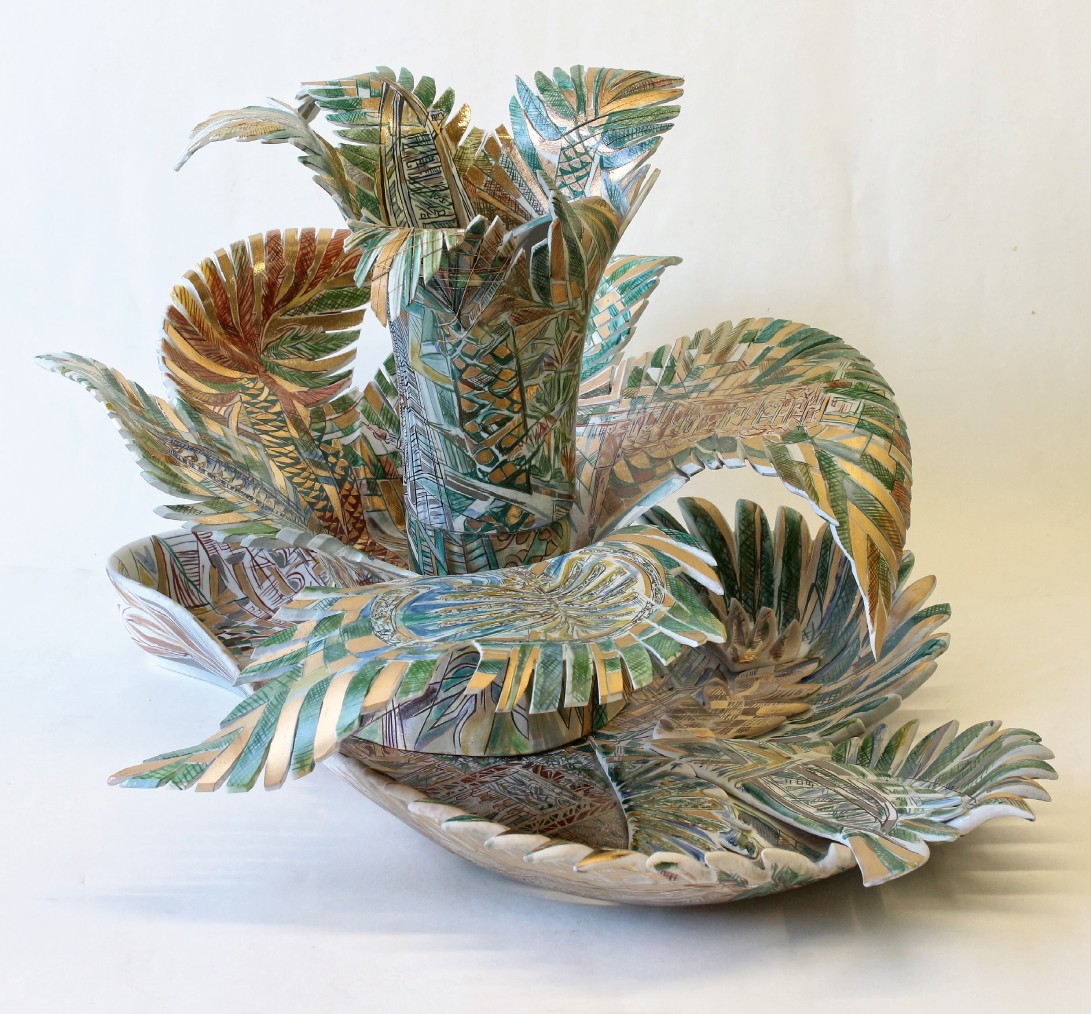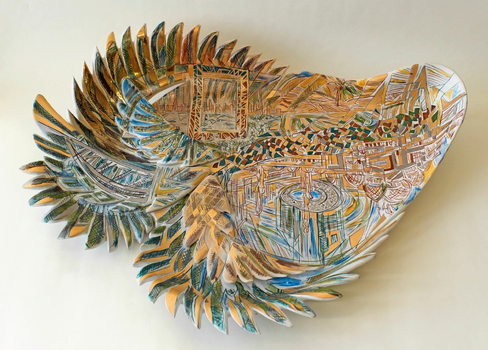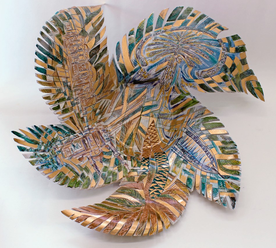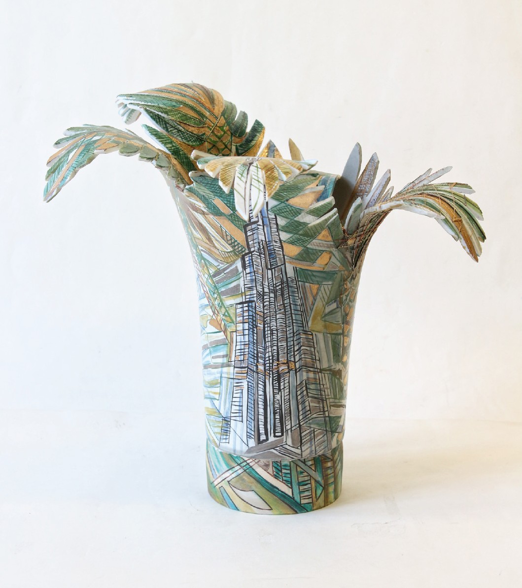 Všechny tři prvky triptychu „Palmy – stromy slunce“ jsou vytvořené z vysoce kvalitního českého kaolinu páleného na biskvit (bezglazurový porcelán). Hluboká mísa i váza jsou umístěné na speciálních keramických soklech. Triptych je poctou palmovým stromům, tropické vegetaci a přírodní i architektonické rozmanitosti Arabského poloostrova. Kompozice všech tří děl vizuálně propojuje motivy přírody s významnými stavbami Blízkého východu. Na objektech jsou citlivě zachyceny ikonické stavby jako Burj Khalifa (nejvyšší mrakodrap světa), hotel Burj Al Arab ve tvaru plachty, umělé ostrovy Palm Jumeirah v podobě rozvětvené palmy, nádherná Jumeirah Mosque či impozantní Velká mešita šejcha Zaída v Abú Dhabí. Kromě architektury jsou do detailů vykresleny motivy oáz, pouštních dun, jeskyní a dalších přírodních jevů Arabského poloostrova, což dohromady vytváří obraz krajiny tepla, života a duchovní hloubky. Každý objekt prošel zcela ručním zpracováním – výrobou, tvarováním a detailním prořezáváním listových motivů vysokofrekvenční frézkou. U vázy byly jednotlivé listy za syrova tvarovány oproti ostatním vázám směrem ven. Hluboká mísa je rozdělena na jednotlivé listy, do kterých jsou zakomponovány architektonické zázraky i přírodní detaily, kde dlouhé třásňovité výběžky evokují tropické listoví. Mělká mísa v sobě nese nejen příběh palmy, ale i fragmenty arabských staveb a pouštní krajiny. Unikátem je, že při výrobě byly použity i reliéfní fragmenty vzniklé technickou náhodou (uvolnění kousku listu při prořezu), které byly při výpalu přirozeně včleněny zpět a propojeny glazurou v jednotný celek.